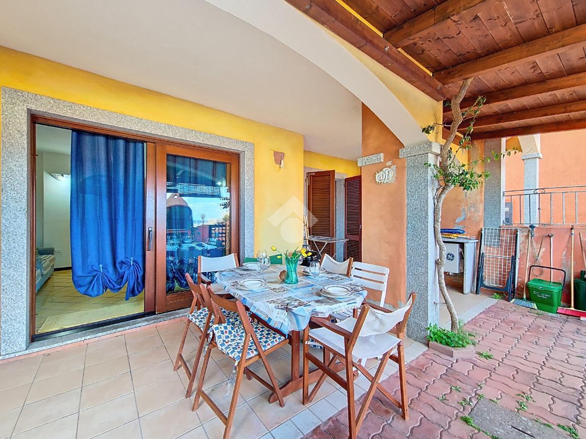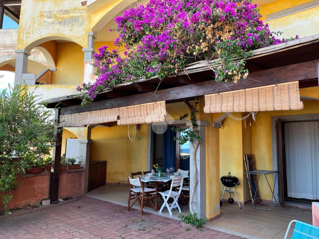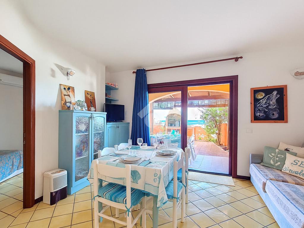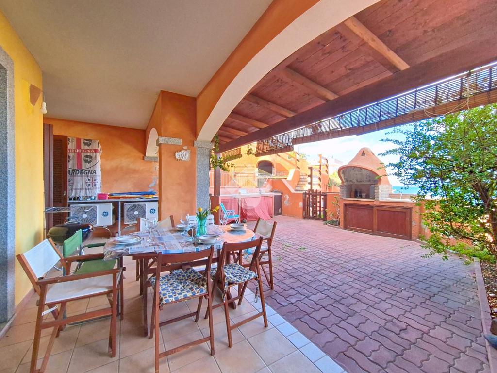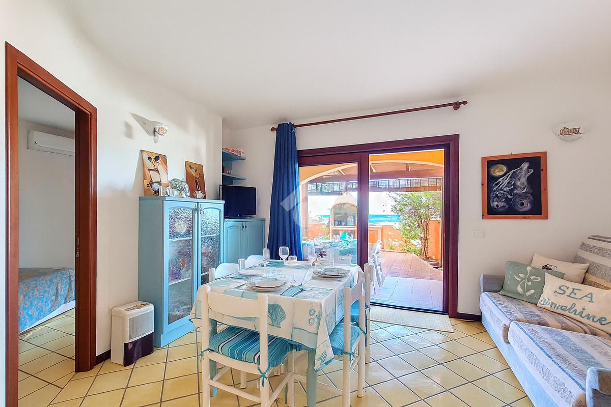 La proprietà si distingue per l'ampio cortile privato, un vero valore aggiunto che permette di pranzare e cenare all'aperto, prendere il sole in totale relax o lasciare che i più piccoli giochino in tutta sicurezza. Dal cortile si accede alla luminosa zona giorno composta da sala pranzo con angolo cottura. Un disimpegno conduce al bagno, rifinito in elegante cera sarda, e alla camera matrimoniale, anch'essa con affaccio diretto sul cortile.