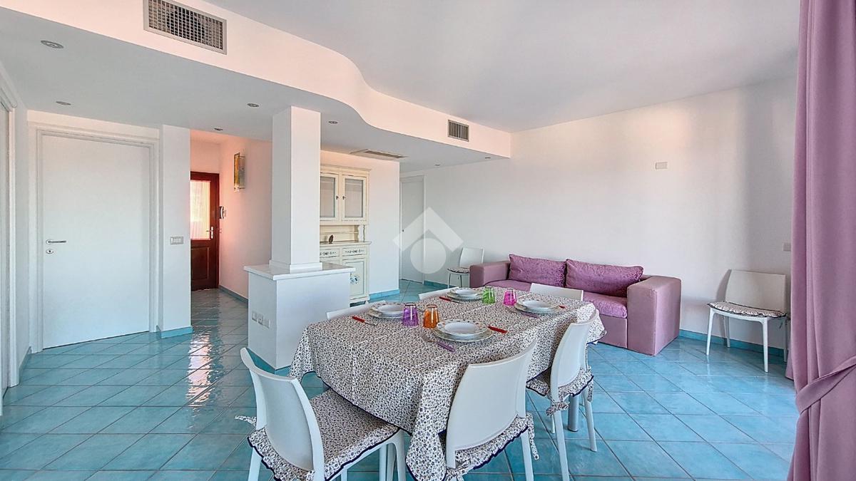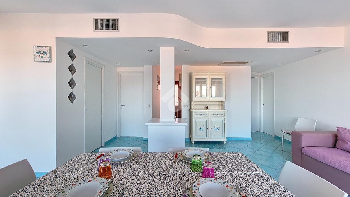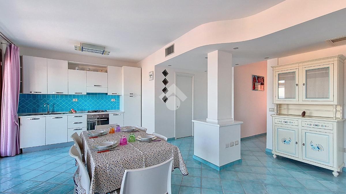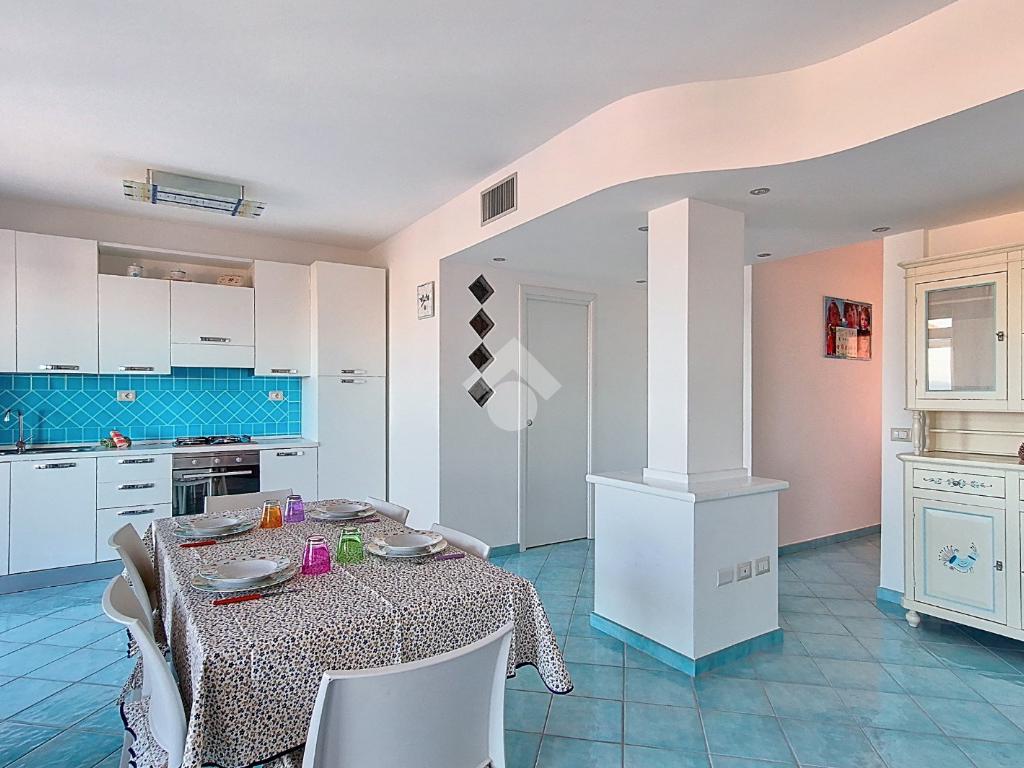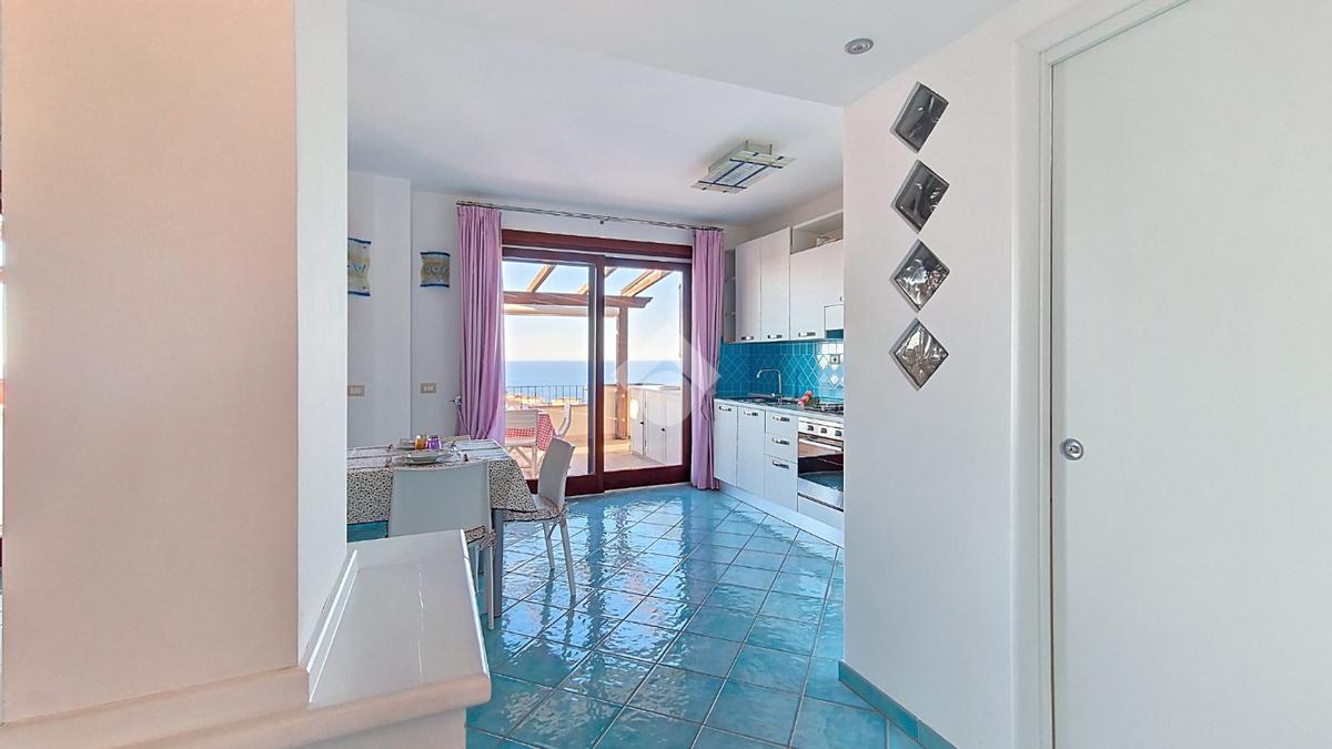 La zona giorno ampia con angolo cottura si presenta ariosa grazie alle rifiniture moderne e al pavimento di ceramica lucido e del colore del mare.