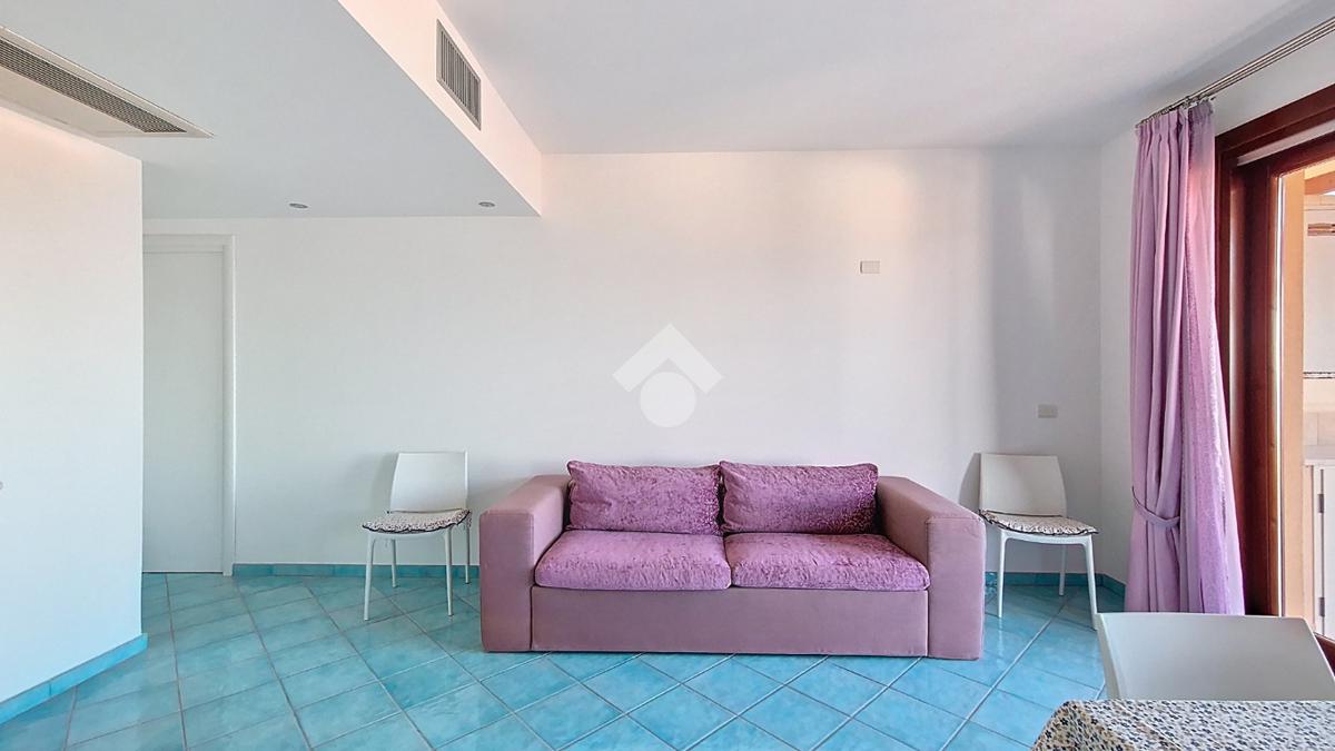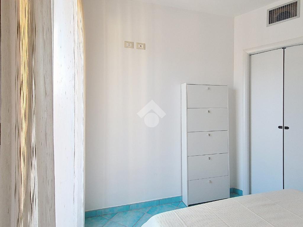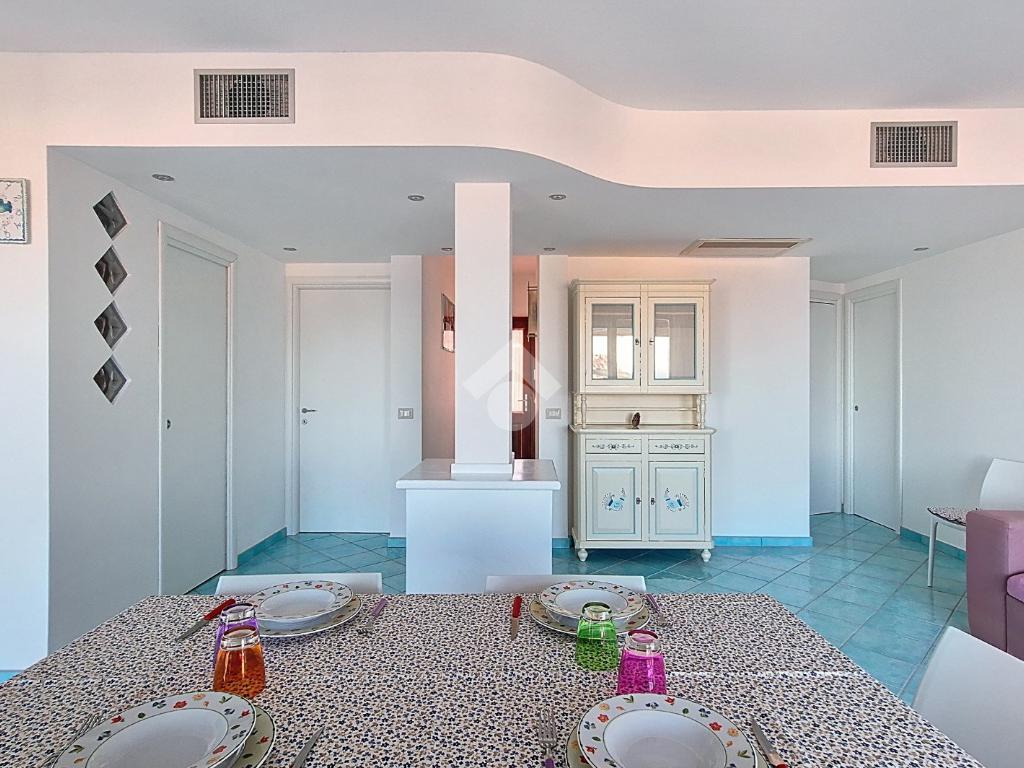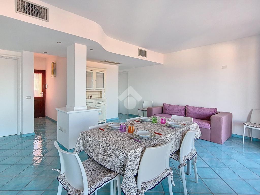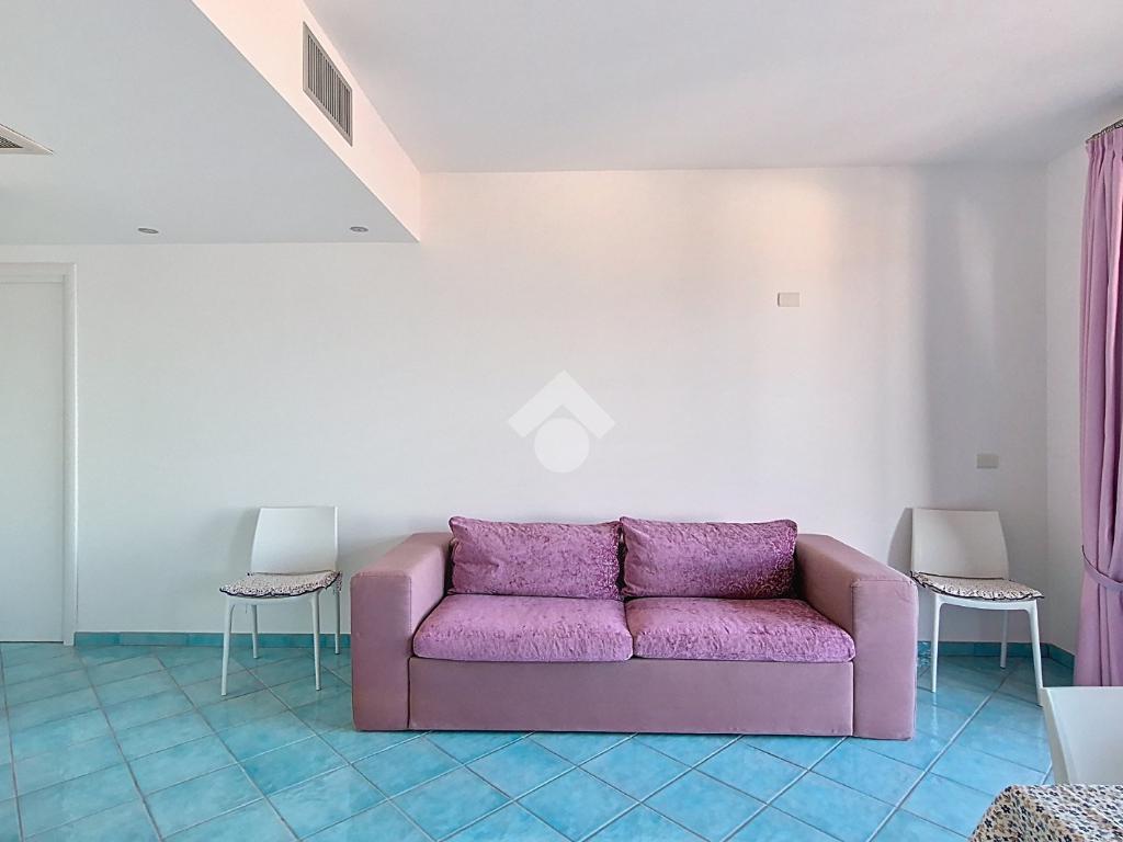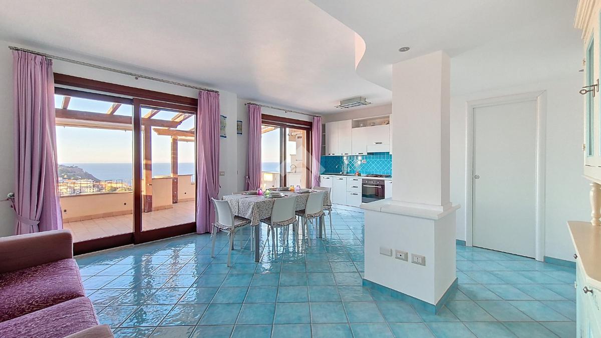 La zona giorno ampia con angolo cottura si presenta ariosa grazie alle rifiniture moderne e al pavimento di ceramica lucido e del colore del mare.