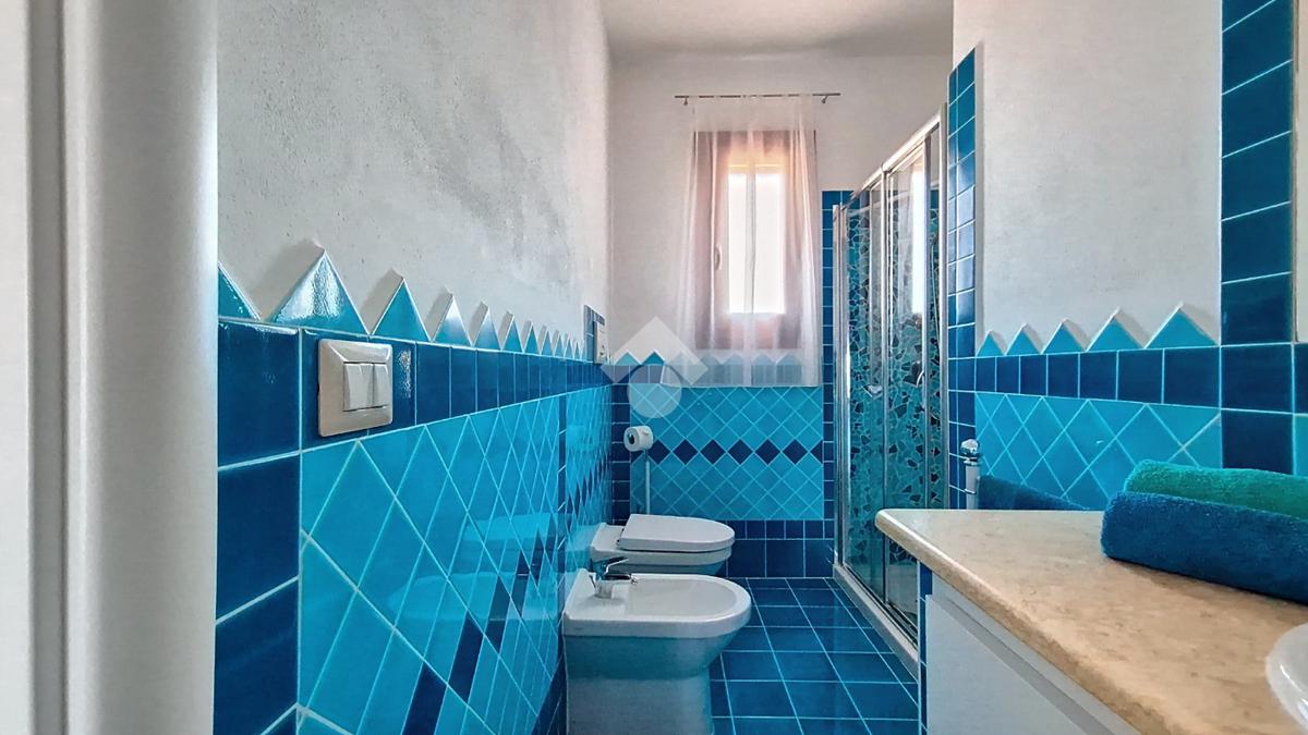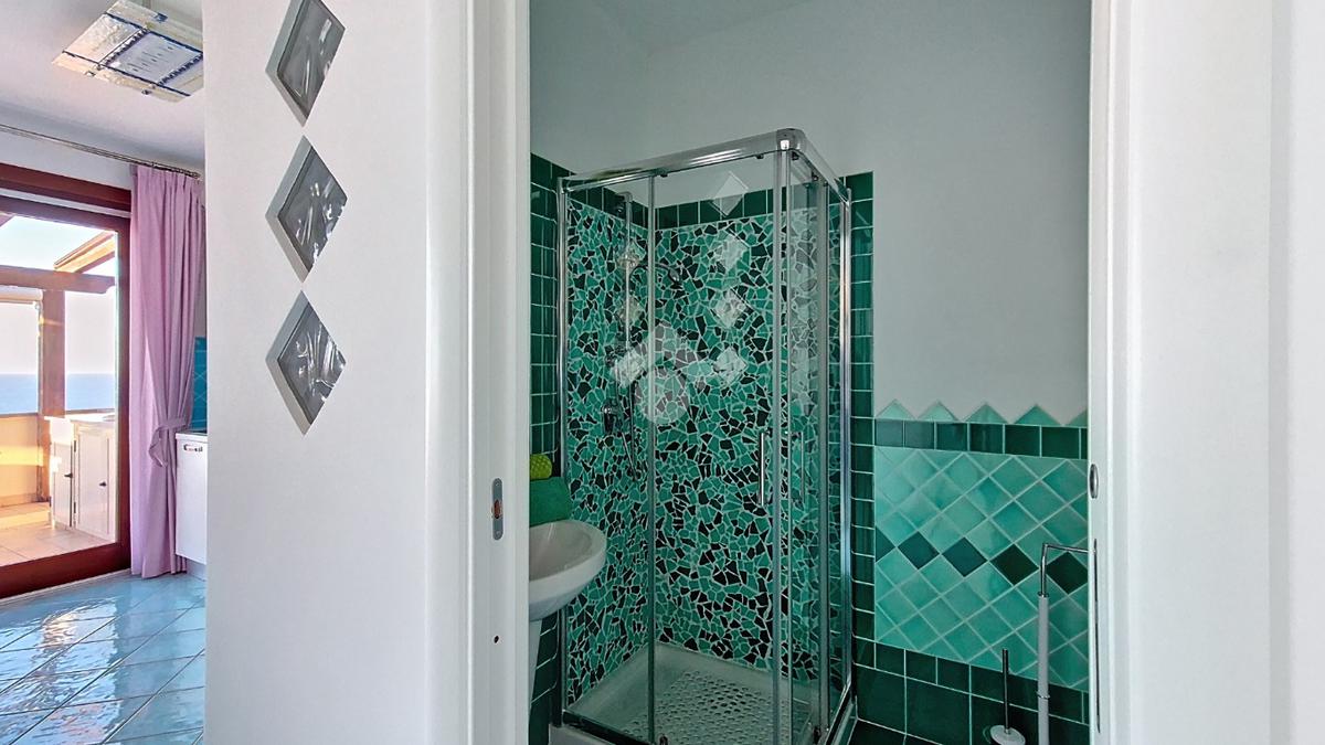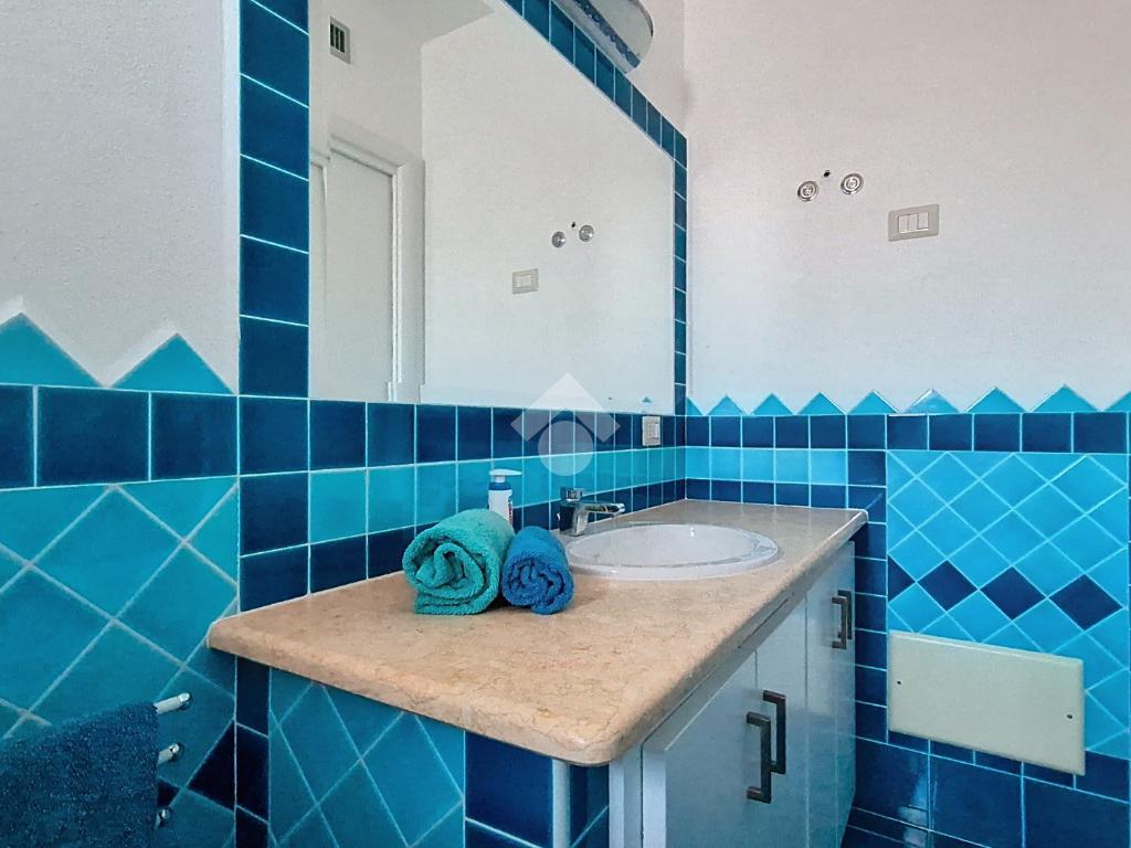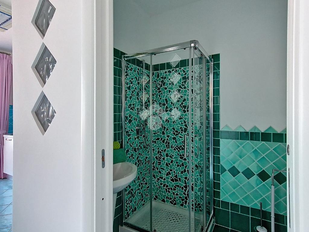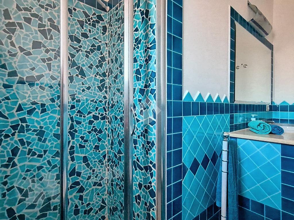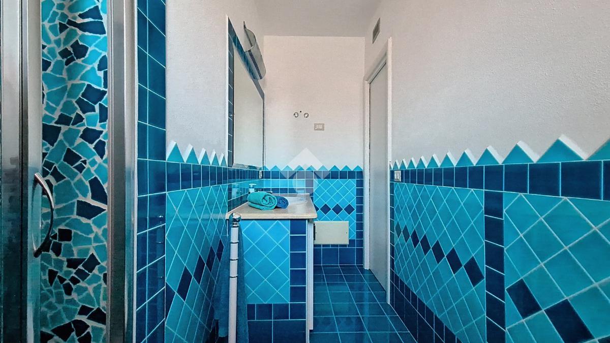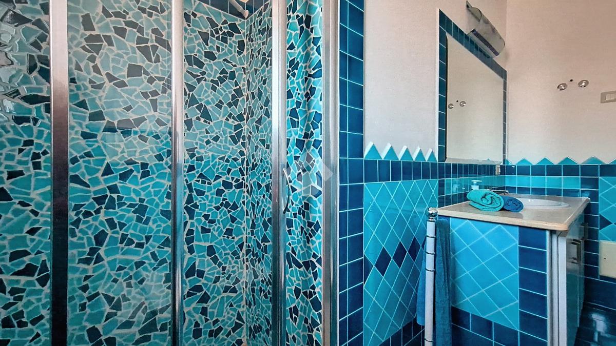 Tramite un piccolo disimpegno si accede al secondo bagno di questa soluzione, elegante e funzionale, è rifinito anch'esso in ceramica sarda con doccia rivestita in mosaico sui toni del blu.