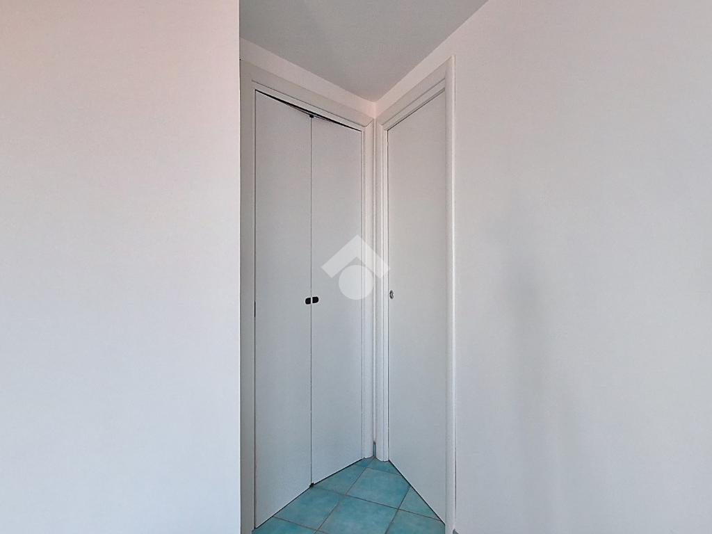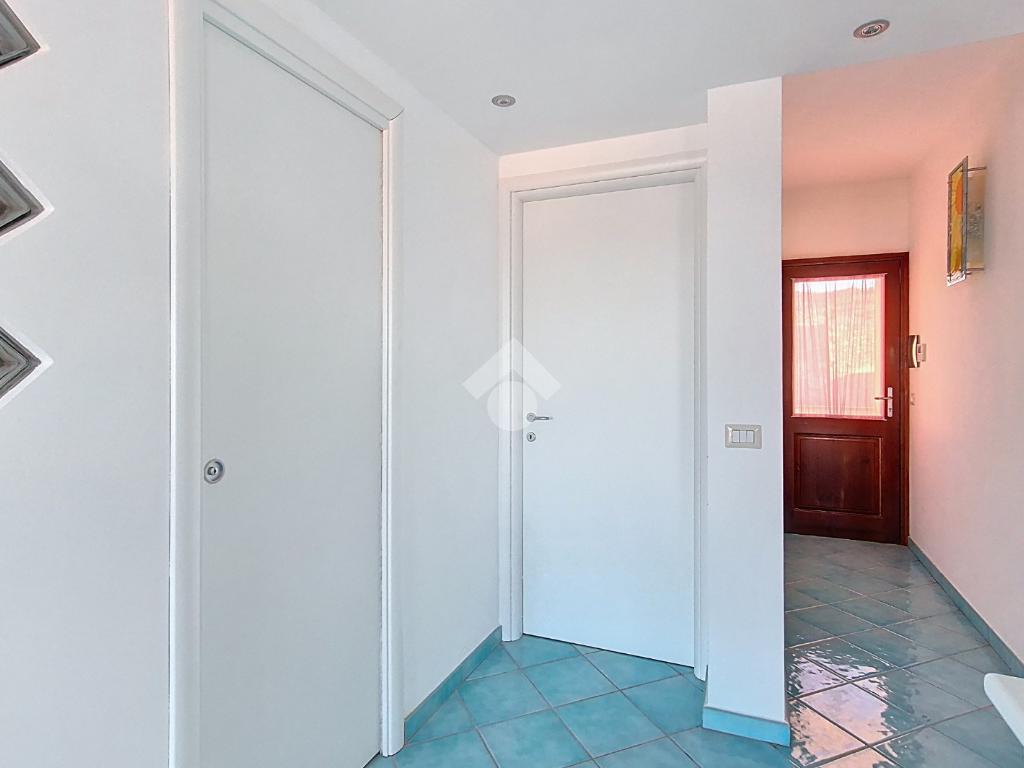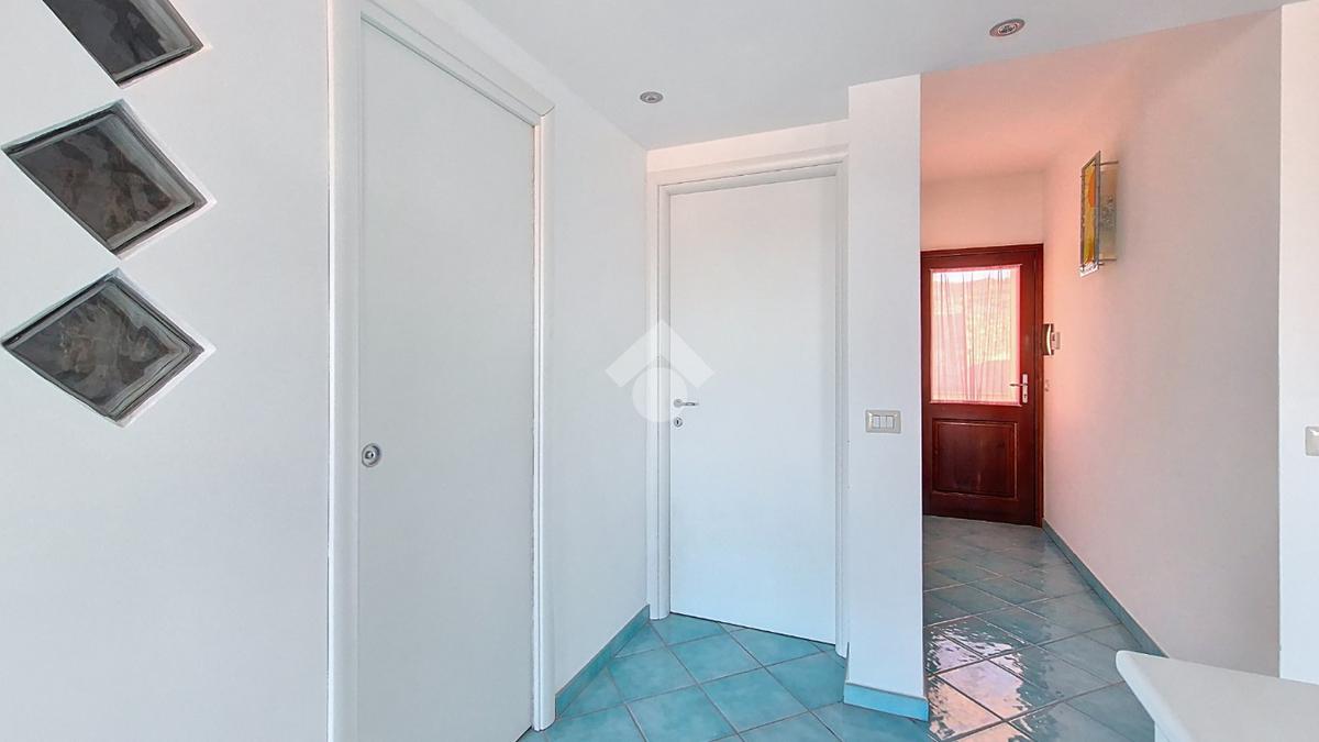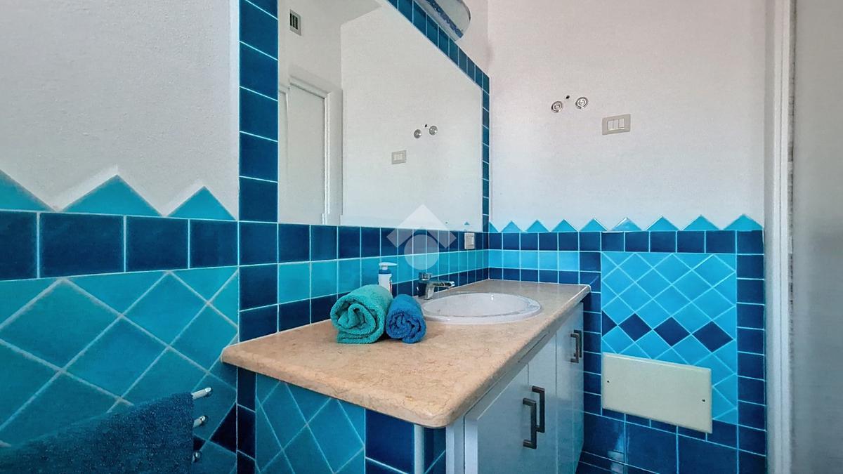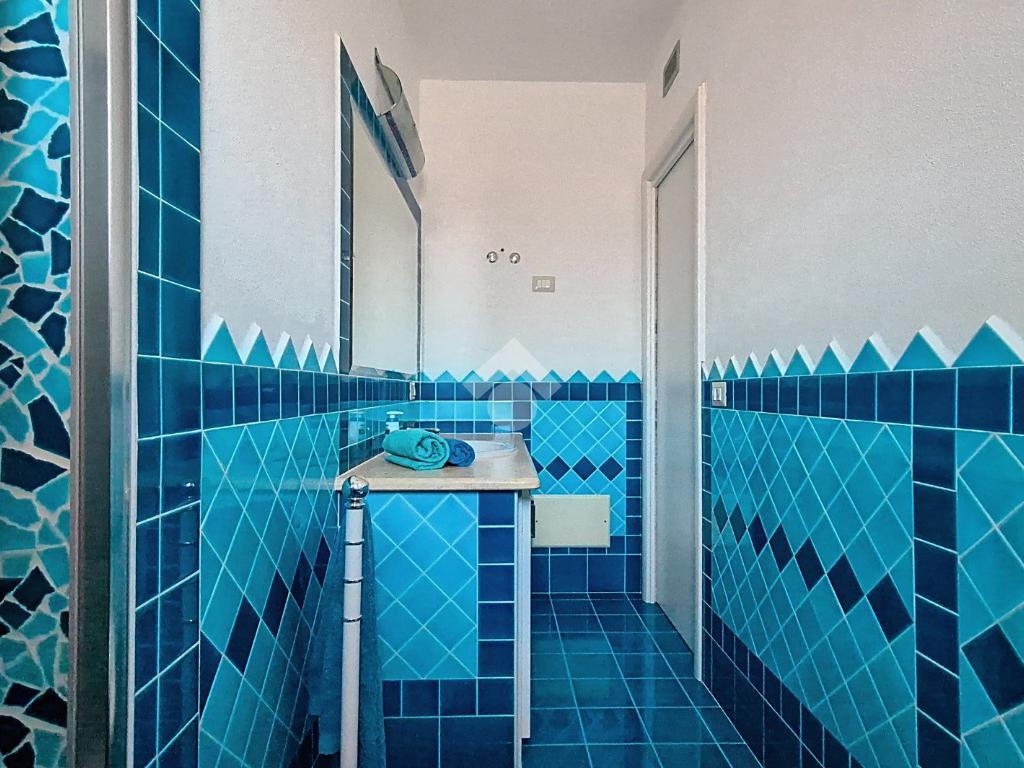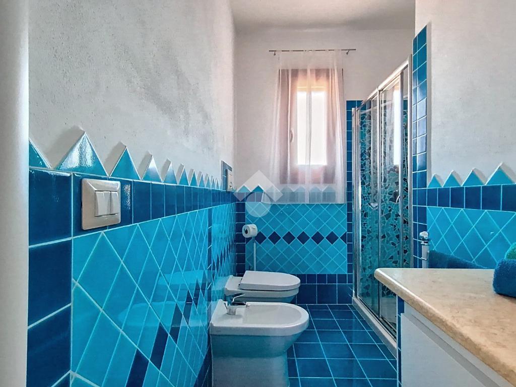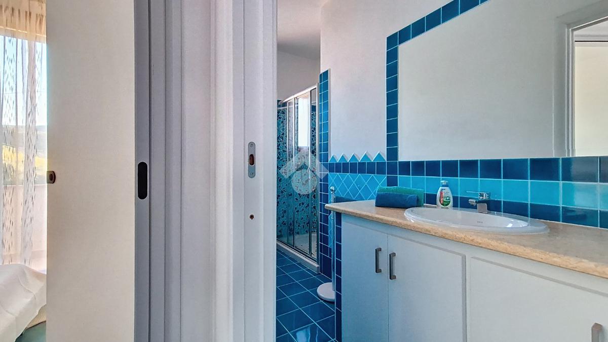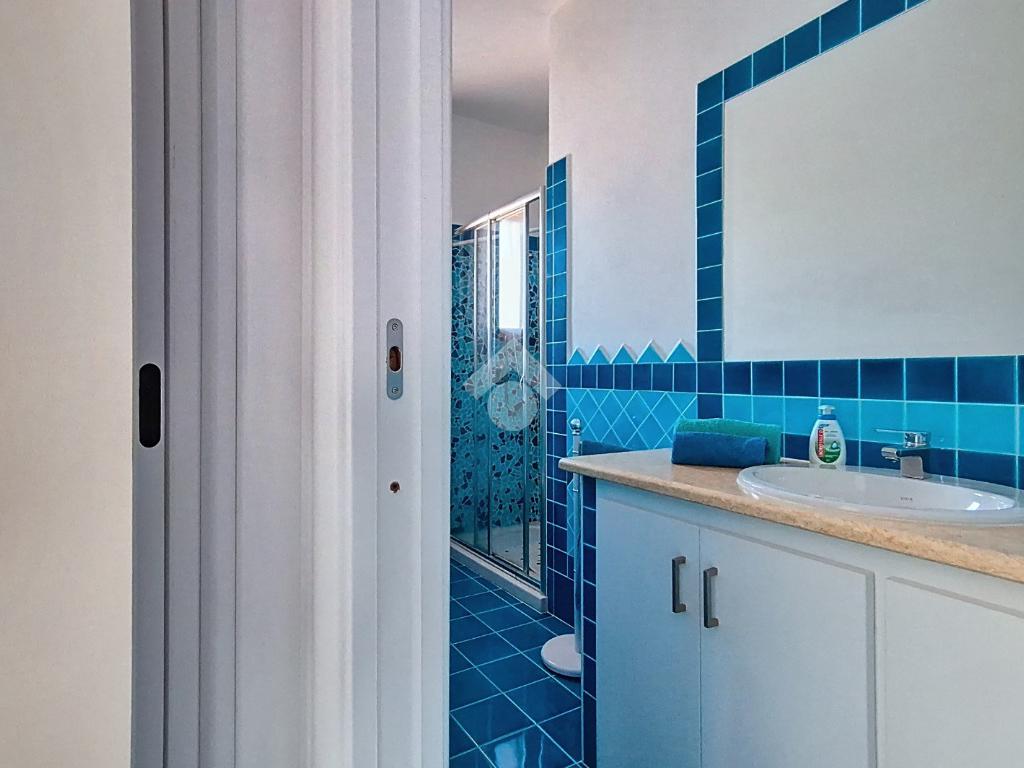 Tramite un piccolo disimpegno si accede al secondo bagno di questa soluzione, elegante e funzionale, è rifinito anch'esso in ceramica sarda con doccia rivestita in mosaico sui toni del blu.