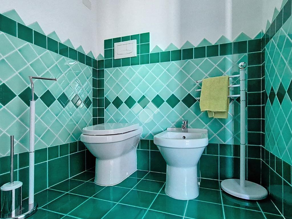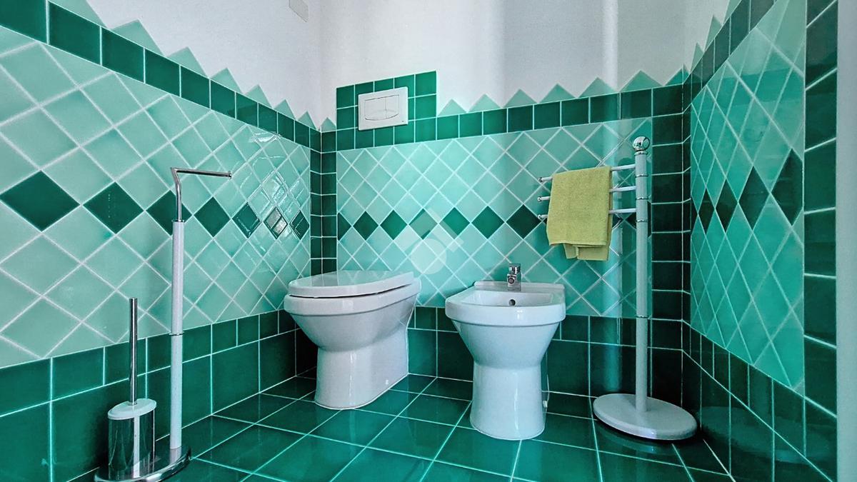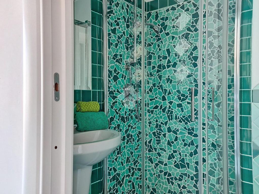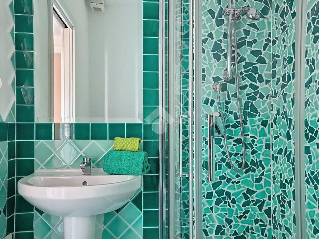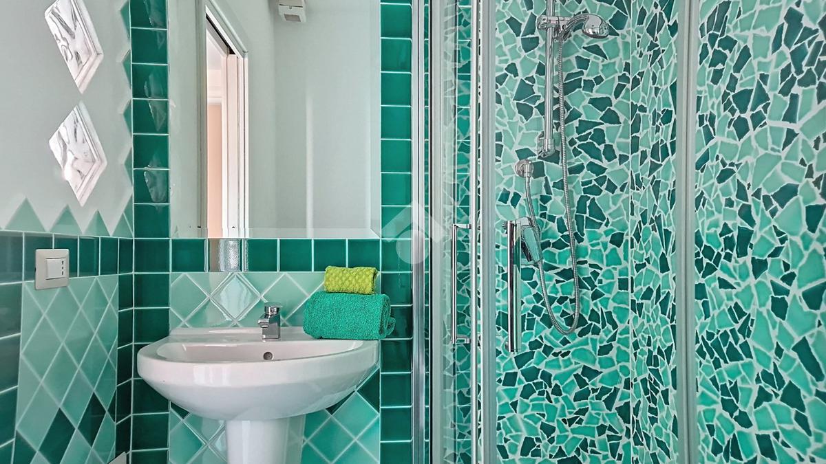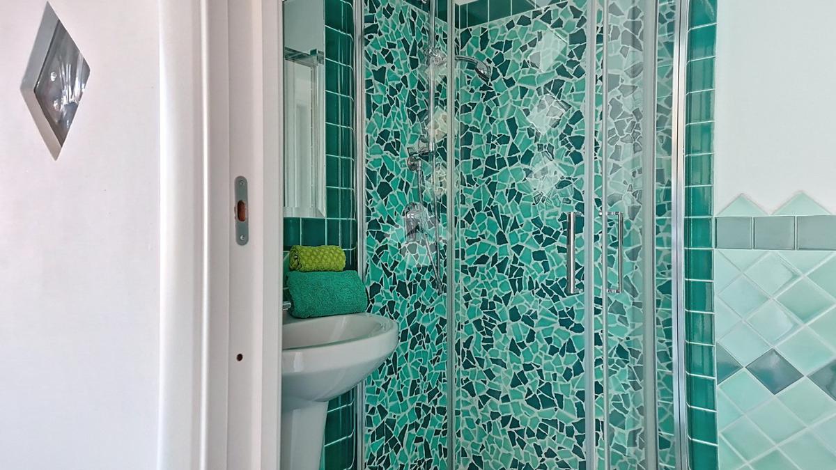 A servizio della zona giorno un primo bagno rifinito in ceramica sarda e con doccia in mosaico sui toni del verde.