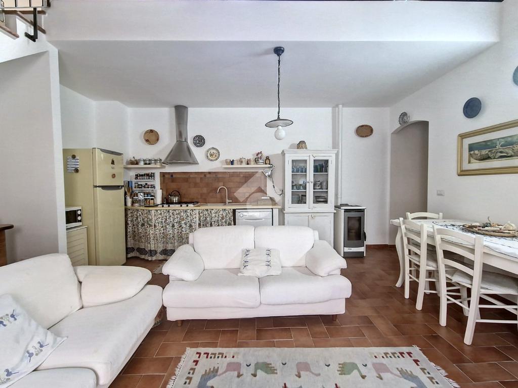 Al primo piano troviamo due camere da letto e un bagno, mentre la zona giorno accoglie un soggiorno luminoso con terrazzino vista mare e angolo cottura, perfetto per vivere momenti di relax con lo sguardo rivolto all’orizzonte.