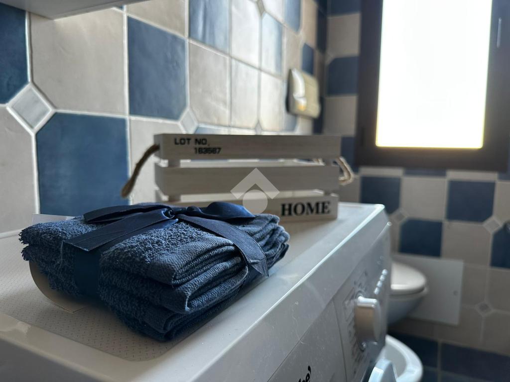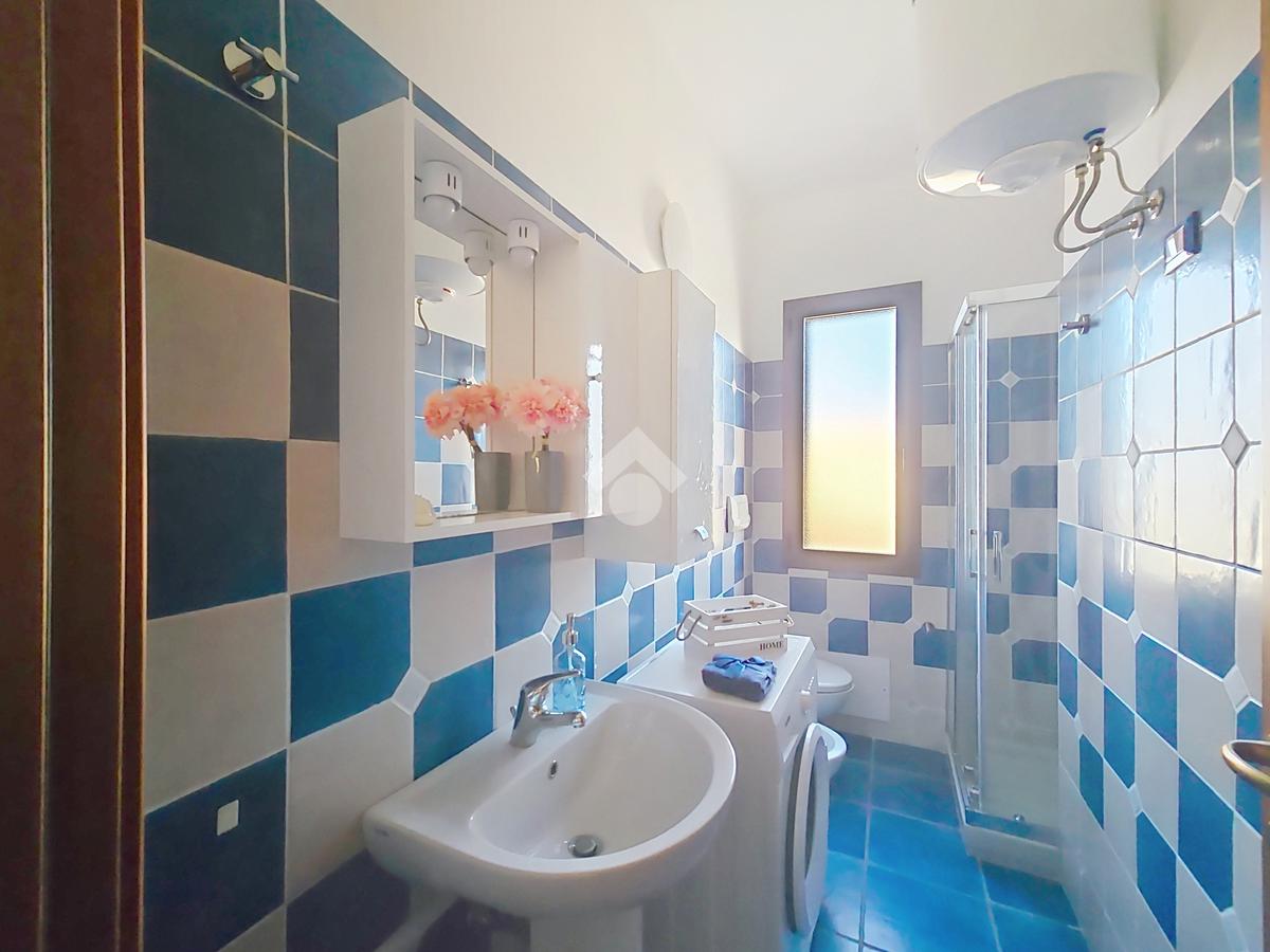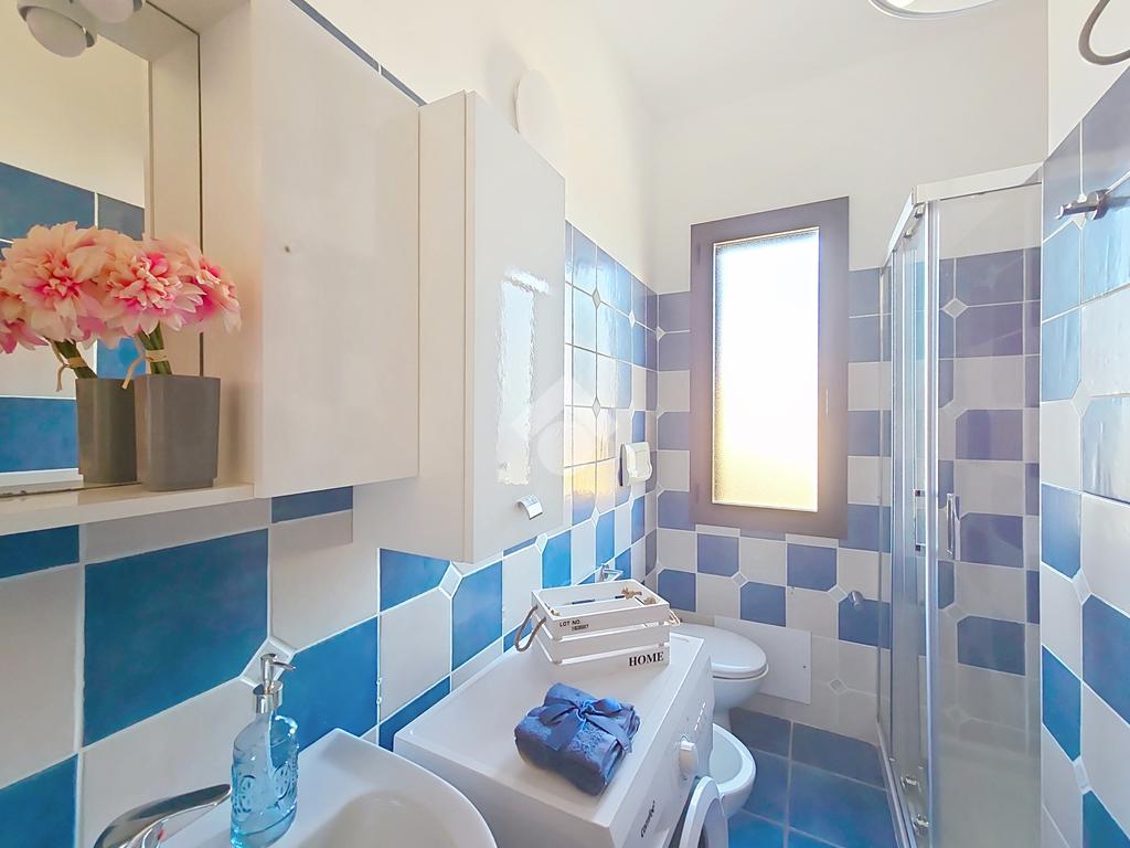 Dal disimpegno accediamo al bagno con doccia dotato di finestra e sulla sinistra un comodo ripostiglio dove poter riporre gli attrezzi da mare.
