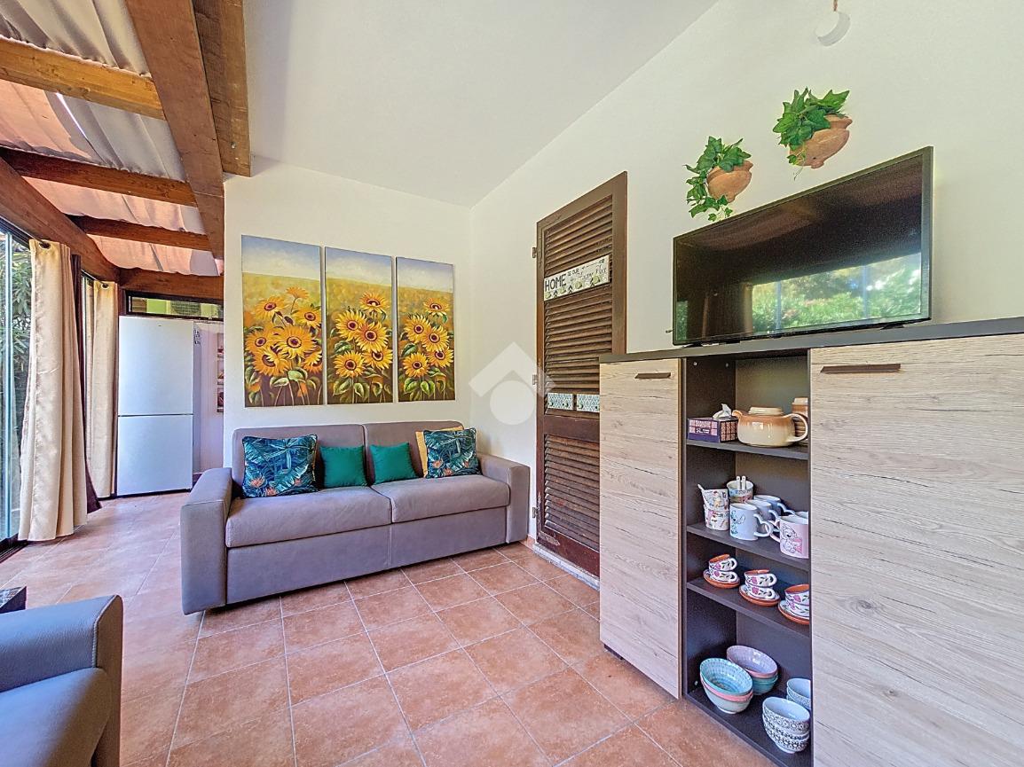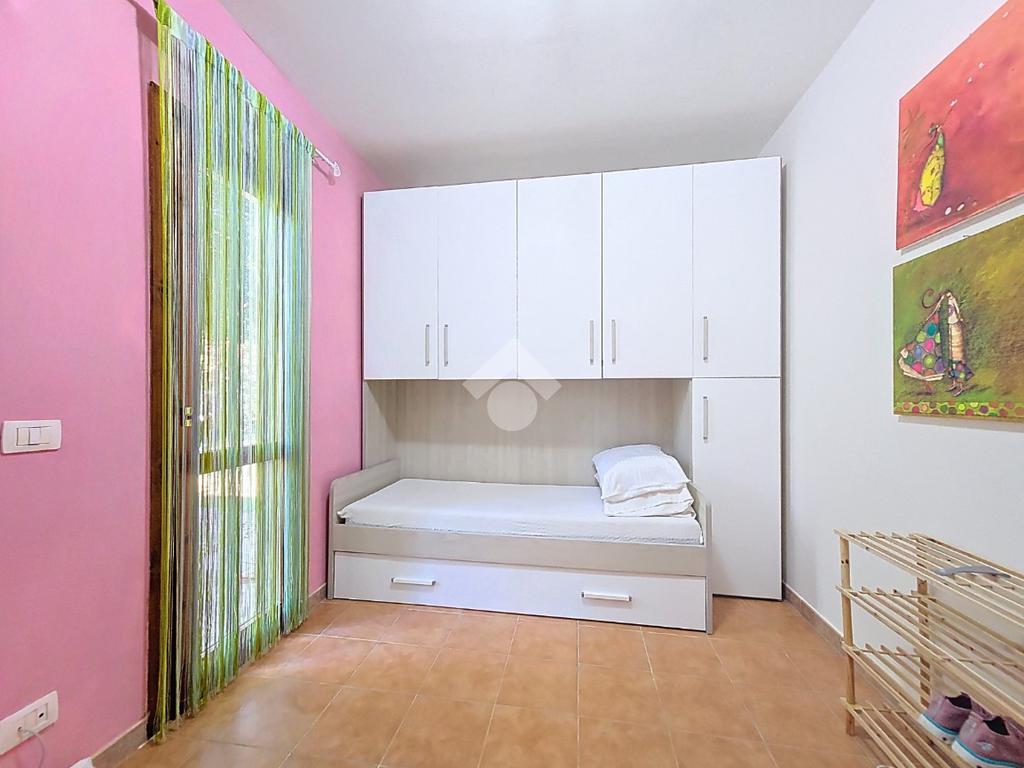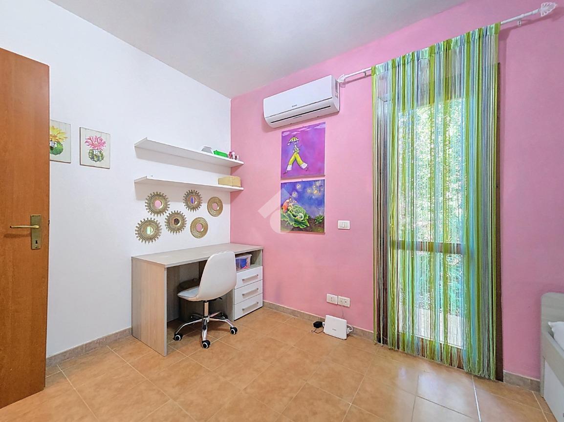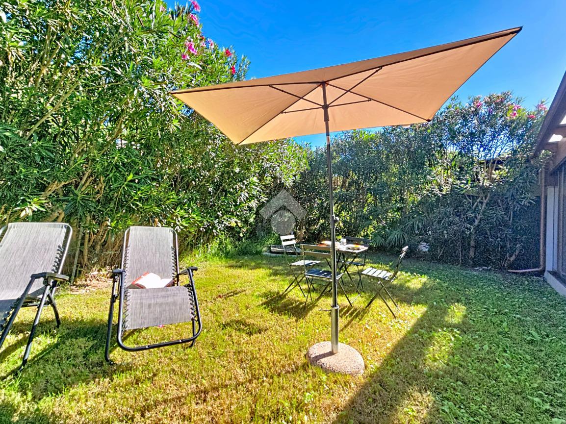 Dalla cameretta grazie alla porta finestra accediamo al giardino, un angolo di pace e privacy assoluta rifinita con prato verde dove è presente una doccia esterna funzionale al rientro dalla spiaggia.
