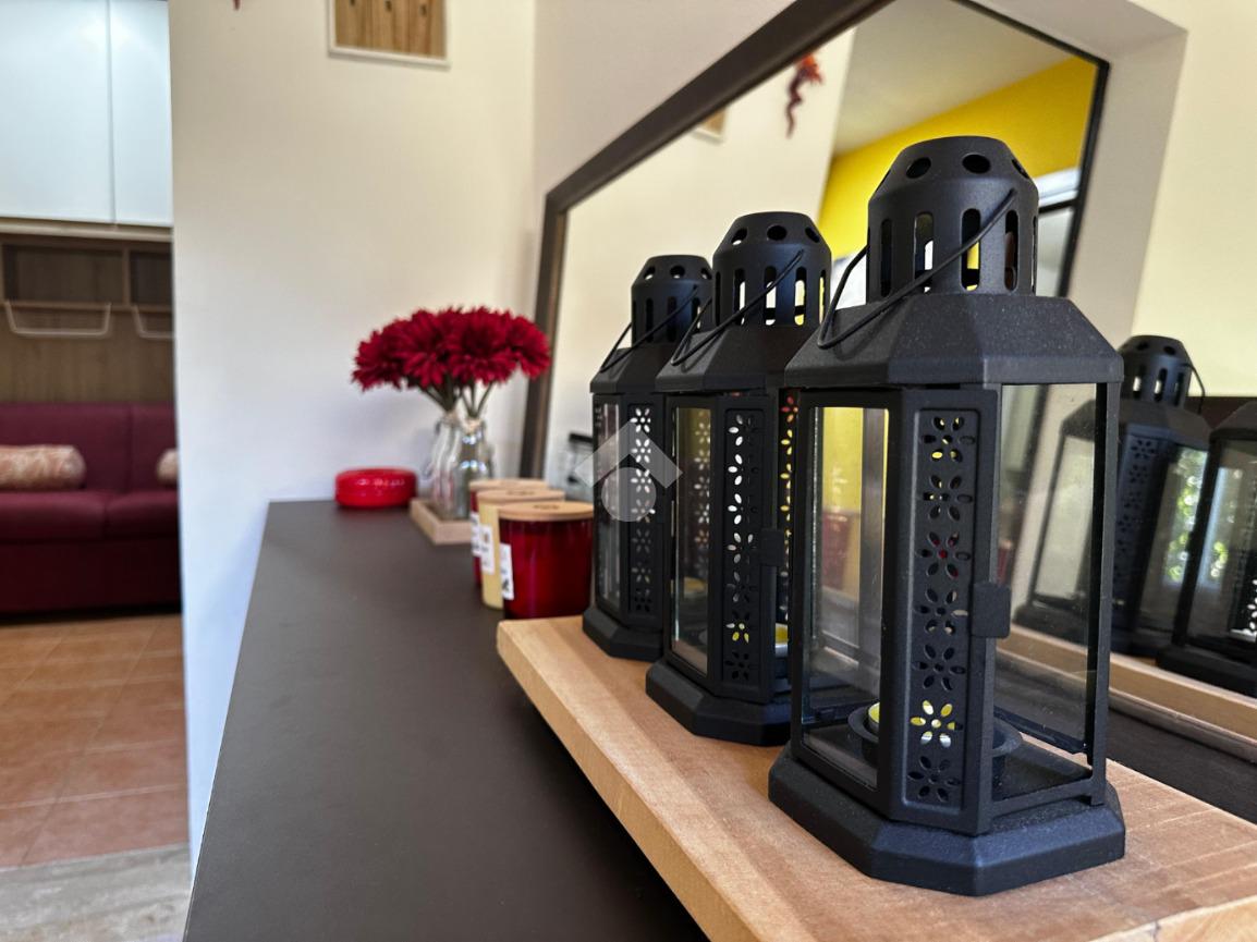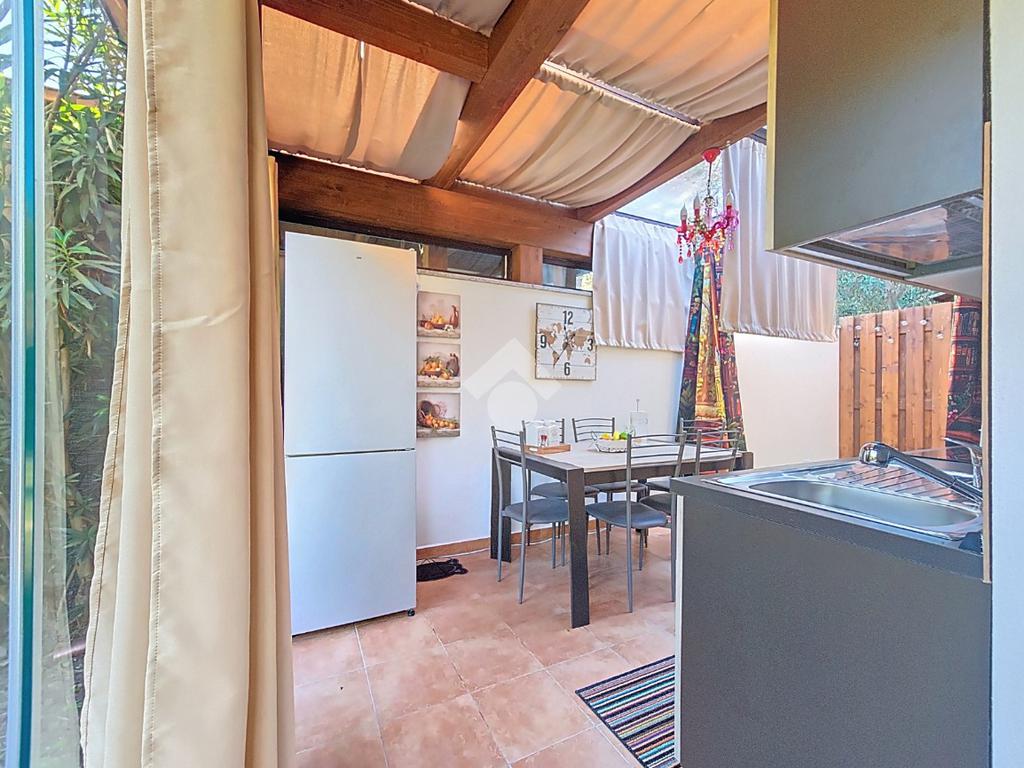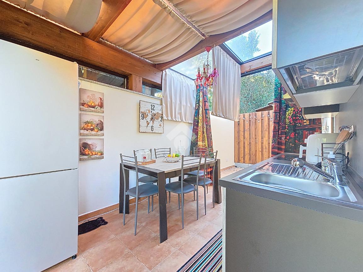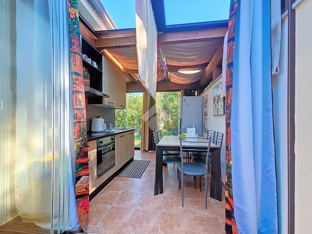 L'ingresso che ci accoglie a questa esclusiva porzione di bifamiliare, è valorizzato dalla presenza del verde lungo tutto il passaggio al giardino di esclusiva proprietà, accediamo alla casa tramite porta finestra che grazie alla presenza di vetrate scorrevoli è stato ricavato uno spazio accogliente vivibile anche nella stagione invernale.
