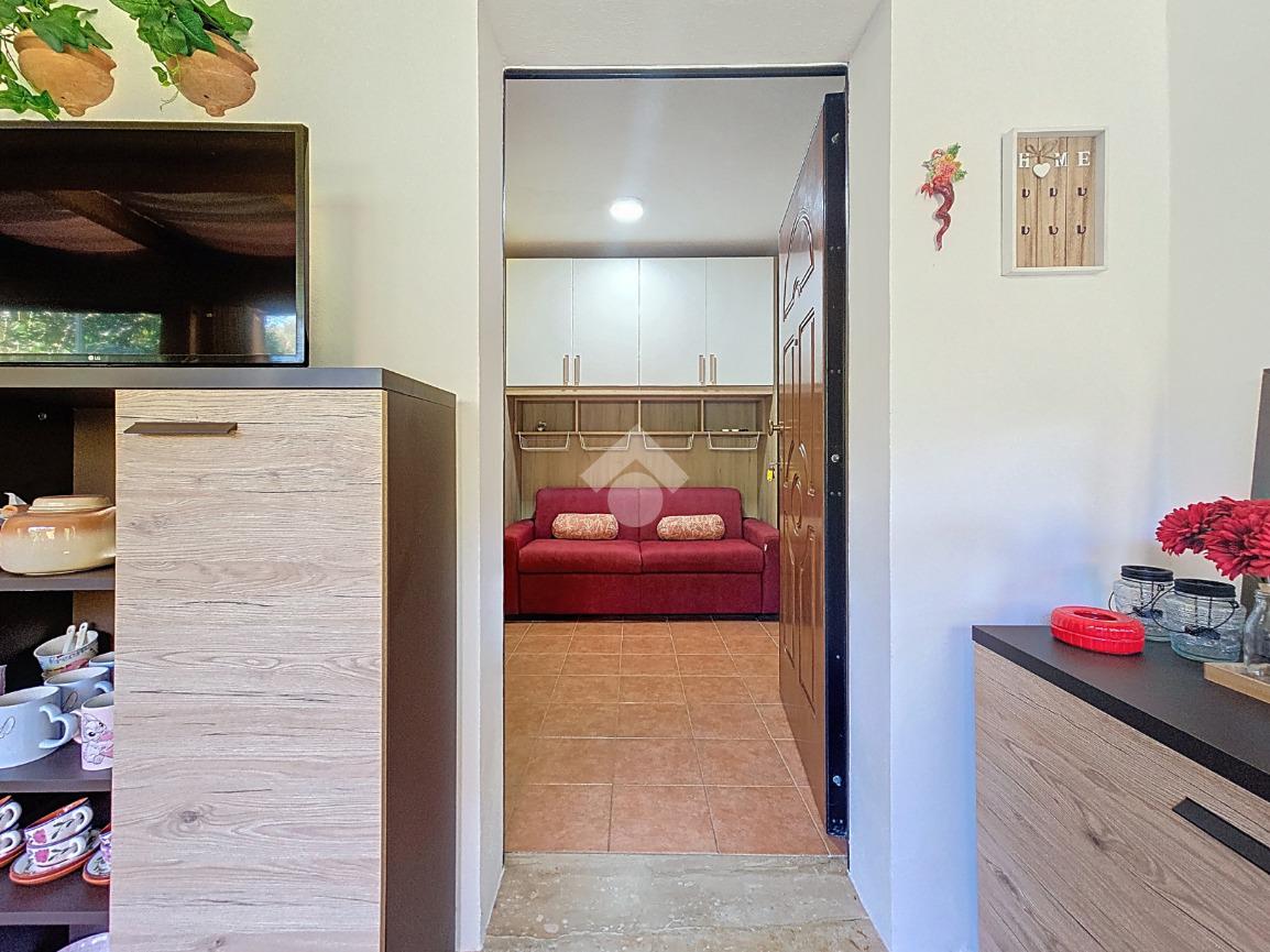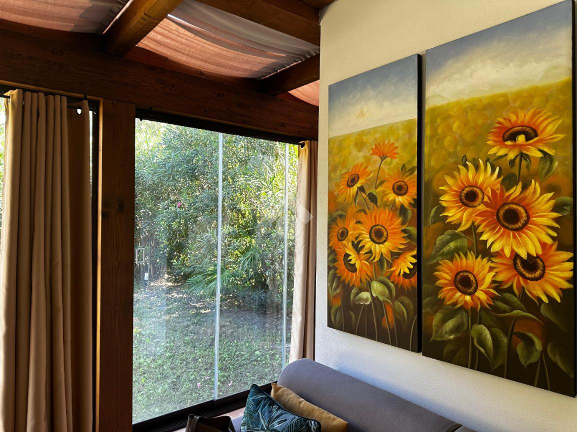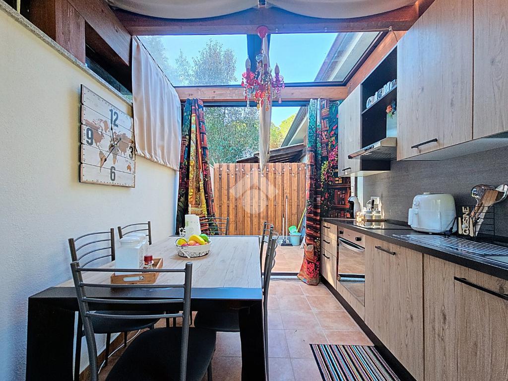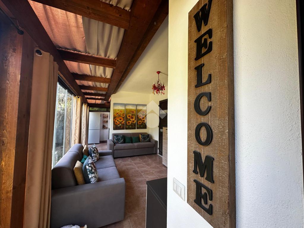 L'ingresso che ci accoglie a questa esclusiva porzione di bifamiliare, è valorizzato dalla presenza del verde lungo tutto il passaggio al giardino di esclusiva proprietà, accediamo alla casa tramite porta finestra che grazie alla presenza di vetrate scorrevoli è stato ricavato uno spazio accogliente vivibile anche nella stagione invernale.